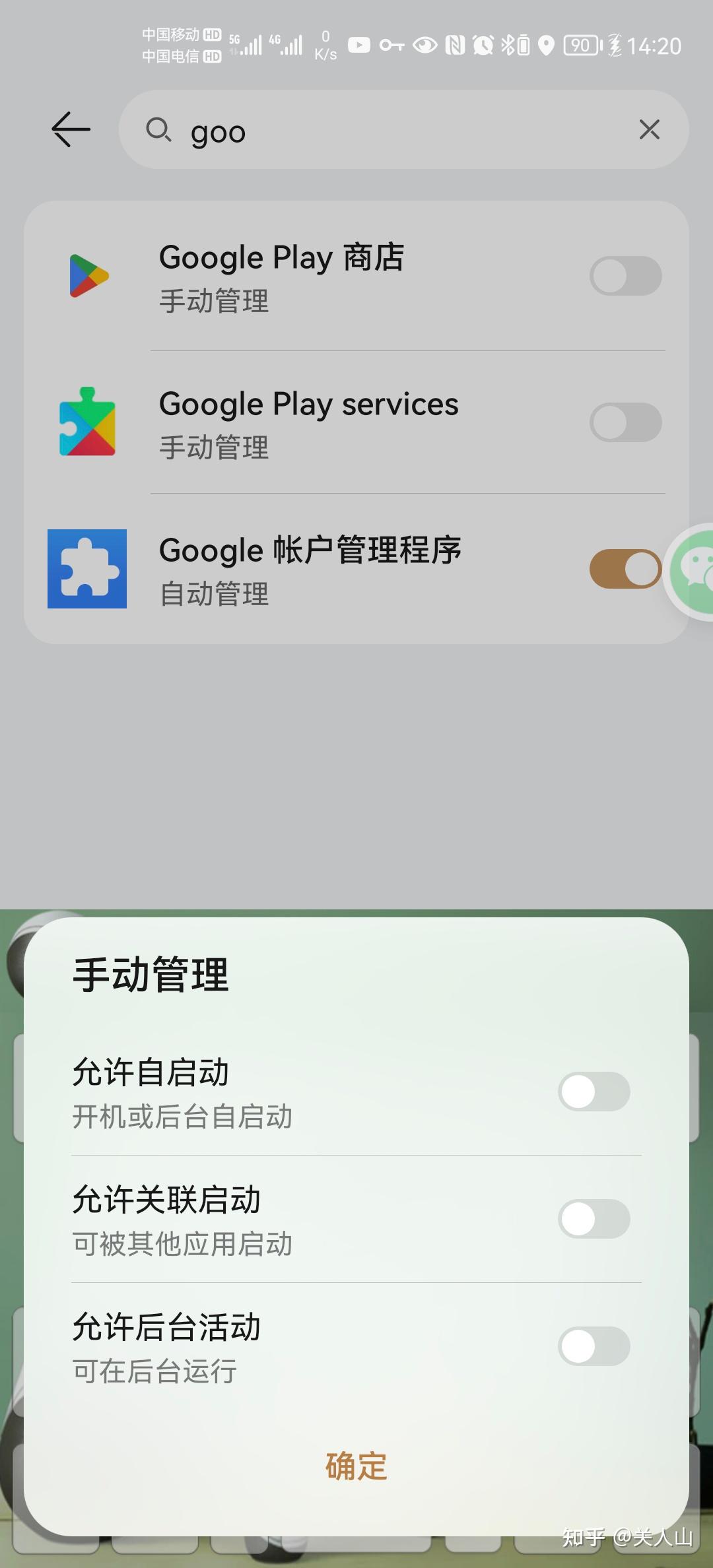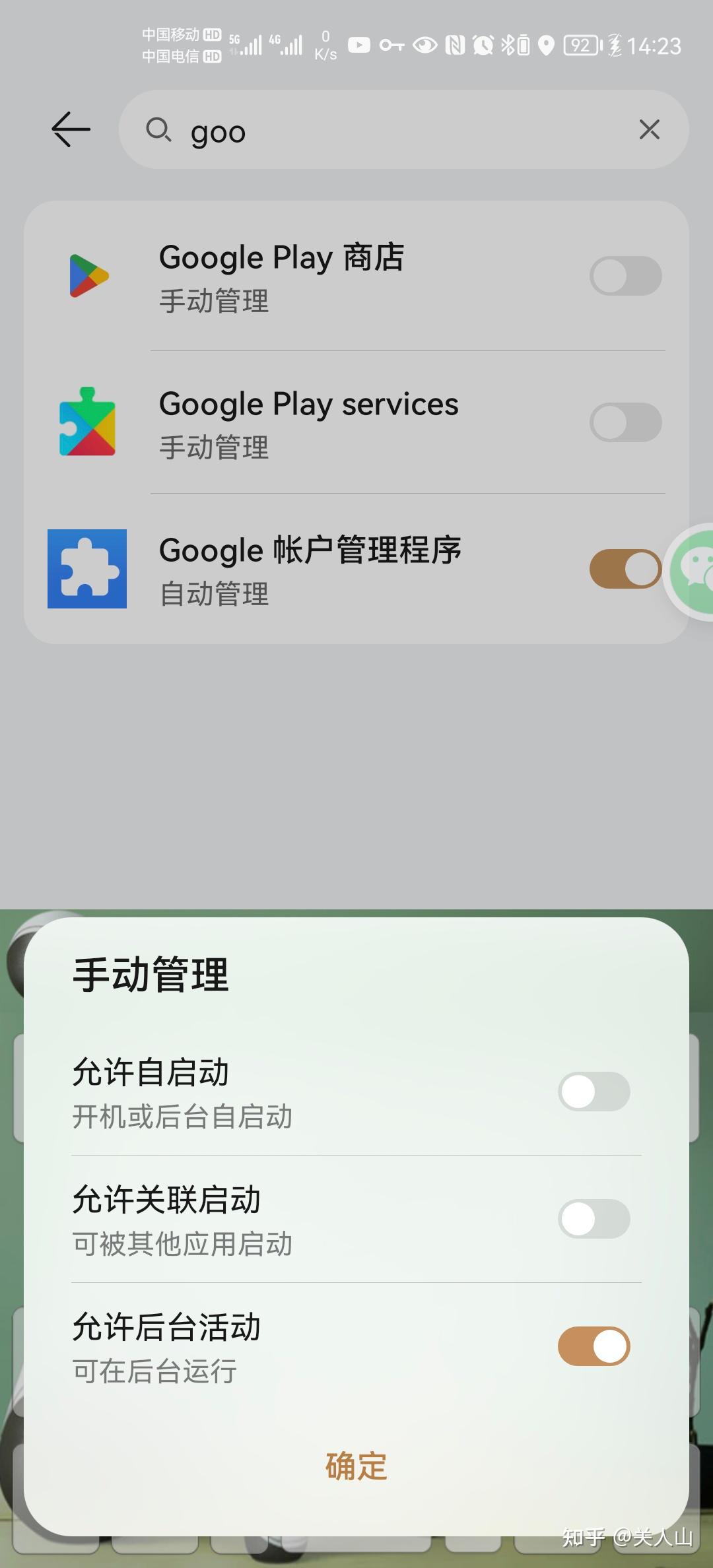 【Google play 商店】设定为手动管理,自启动和关联启动关闭,后台活动打开(如果后台活动关闭,那么在商店里面下载东西的时候,一切换到后台就会停止下载)。