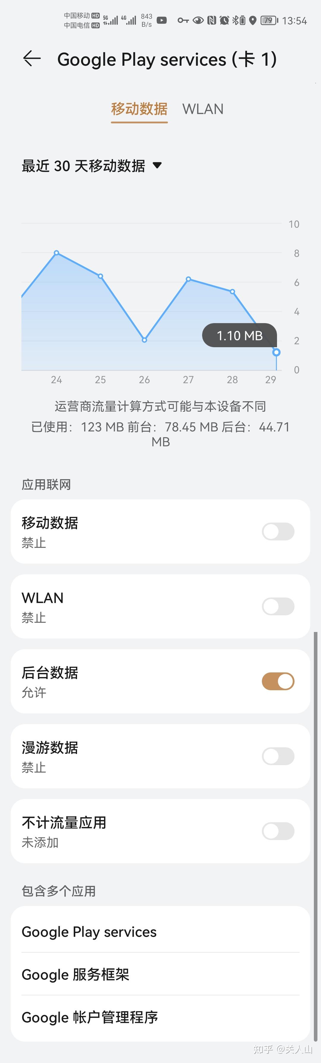 2、【设置-移动网络-流量管理】,下拉看到本月数据流量排行,点右边的更多,搜到【Google Play service】,把应用联网的开关都关闭掉。